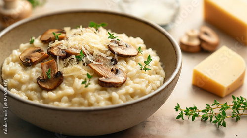 A hearty bowl of creamy mushroom risotto garnished with fresh thyme and grated cheese, showcasing a delectable combination of flavors and textures.