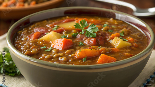 A hearty bowl of thick lentil soup with vegetables served on a rustic table, perfect for a cozy evening meal. Generative AI