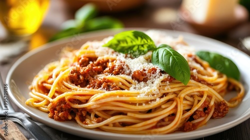 A hearty plate of spaghetti Bolognese with meat sauce, topped with fresh Parmesan cheese and basil leaves.