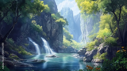A hidden canyon with a tranquil river flowing through, surrounded by towering cliffs, peaceful and serene, high definition.