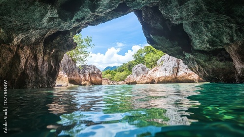 A hidden lagoon on Koh Muk, surrounded by towering rock formations.