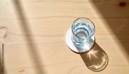 glasses, water, coaster, table, shadow, hydratation, wellness, branding, drink, still life, interior design, photo, composition, aesthetic, art, design, advertising, product, contrast, brightness, sharpened, depth of field, ai, generative