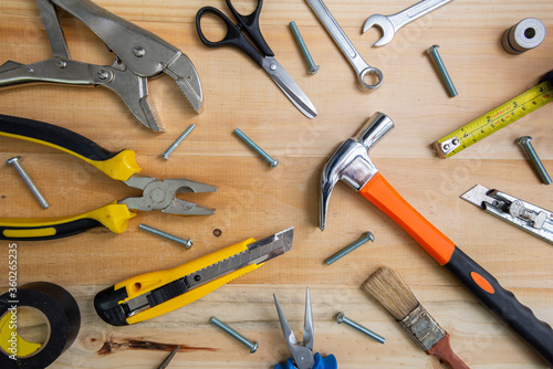 A high angle shot of many working instruments on a light wooden surface. construction tools on wooden background shot from above. Top view, flat lay. Construction, repair, production and DIY concept.