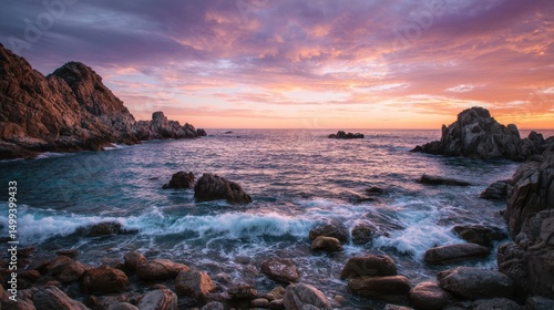 A High Resolution image of sunset paints a rocky coves gentle waves.