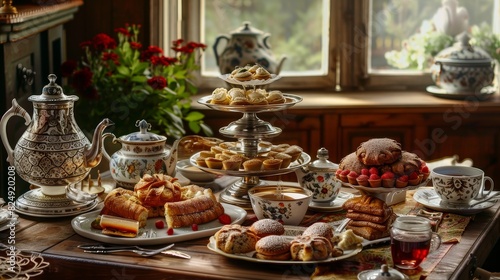 shot, traditional, russian, tea, table, assort, pastry, samovar, set, invite, vase, homelike, cookery, teapot, afternoon, window, flower, cosy, comfort, time, delight, feast, cookie, butter, party, home, jelly, napkin, service, attracted, saucer, art, russia, sugar, ambience, design, display, good, sweet, kitchen, culture, social, richness, treat, bake, puckered, sunlight