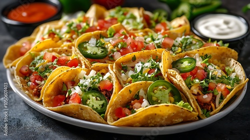 A high-angle view of a serving platter filled with mini tacos, garnished with diced tomatoes, shredded lettuce, and grated cheese, with dipping sauces and jalapeño slices on the side, and bright,
