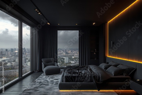 A high-ceilinged bedroom overlooking the city, with black walls and gray furniture. The bed is made of dark wood with soft lighting above it.