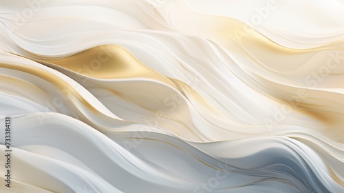 A high-definition snapshot freezes a moment of liquid luxury, as abstract white and golden waves create a resplendent wavy tapestry.