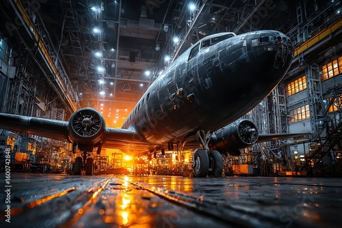 high, detail, image, large, aeroplane, parked, diagonally, hangar, wing, flap, extended, inspection, door, partially, open, warm, natural, light, contrast, aircraft, runway, aerodrome, aviation, jet engine, landing gear, take-off, landing, airliner