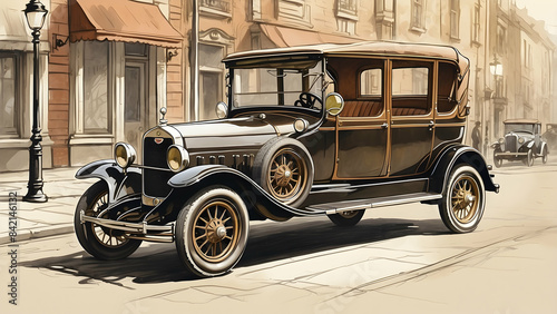 A highly detailed illustration of a vintage car parked on an old city street, indicative of early 20th-century life