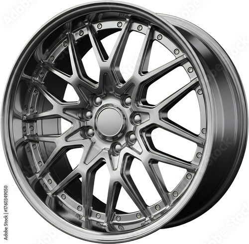 A highly polished intricately designed metallic car wheel with a complex spoke pattern featuring numerous lug nut holes and a circular center cap isolate