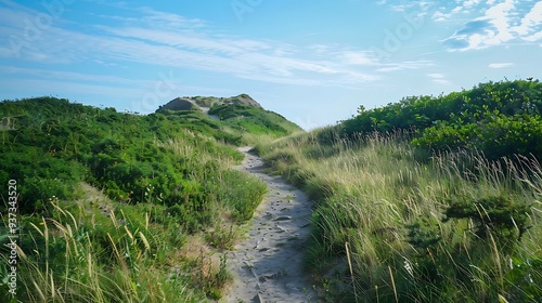 A high-quality shot of a summer hiking trail with lush green vegetation, clear skies, and sun-drenched paths.