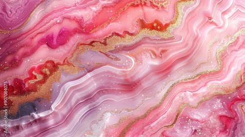 A high-resolution pink marble background featuring intricate gold watercolor patterns and a touch of white glitter. The seamless design includes fluid agate effects, perfect for creating an elegant