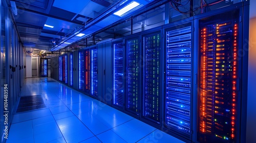 A high-tech server room illuminated with blue lights, showcasing rows of network servers and cables, emphasizing modern data storage and processing.