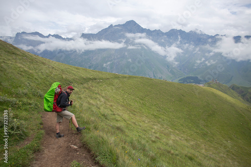 A hiker enjoys a peaceful moment on a scenic trail, surrounded by green hills and towering mountains.