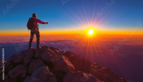A hiker stands on a rocky outcrop, gazing at a breathtaking sunset, silhouetted against a vibrant sky, with the sun setting behind a vast sea of clouds.
