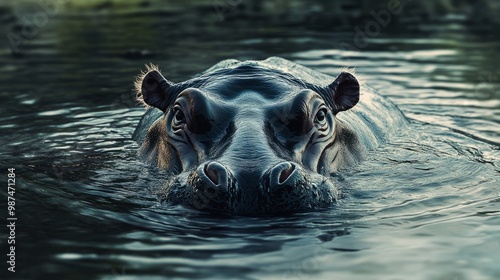 A hippos large face rising out of the water, its nostrils flaring as it takes a breath, with ripples spreading across the surface.