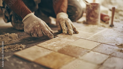 A Hispanic construction worker laying down tiles at a construction site. Featuring craftsmanship and focus