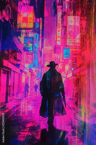 historical, figure, neon, city, futuristic, technology, architecture, retro, contrast, urban, street, vibrant, night, illumination, blend, anachronism, diversity, culture, modernity, digital, imagination, adventure, ambience, exploration, surreal, pathway, shadow, reflections, artistry, vision, innovation, history, parallel, journey, fantasy, dialogue, surrealism, escapism, connectivity, evolution, style, juxtaposition, aesthetic, tradition, transformation, life events