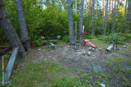 A homemade gym, set up right in the middle of the forest. Various devices for doing sports, including barbells and car tires. Some of the exercise machines are attached to tree trunks.