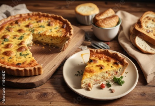 A homemade quiche Lorraine on a wooden table with a side of fresh bread, wooden table, eggs, bread