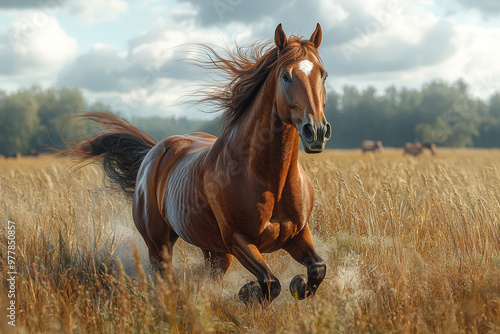A horse galloping across an open field, its mane and tail flowing in the wind. Concept of freedom and dynamic strength.