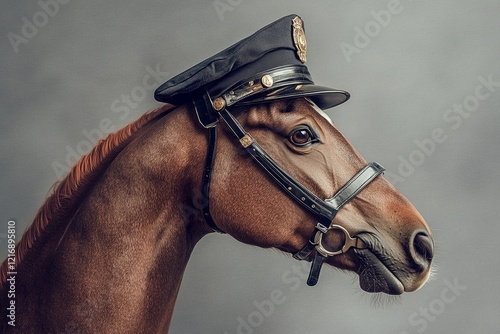 A horse in a police officer cap, with a badge clipped to its collar, on a subtle gray background. picture