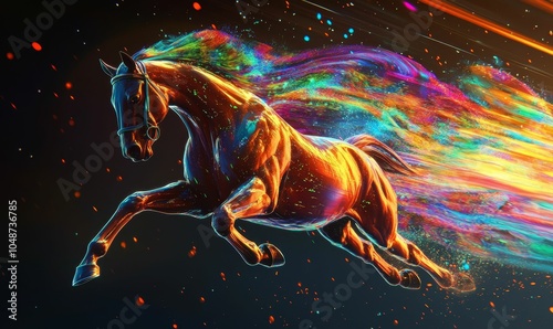 horse, running, gallop, speed, blur, motion, abstract, light, glow, iridescent, rainbow, colourful, digital, art, surreal, fantasy, magical, cosmic, energy, power, dynamic, vibrant, majestic, magnificent, powerful, animal, equine