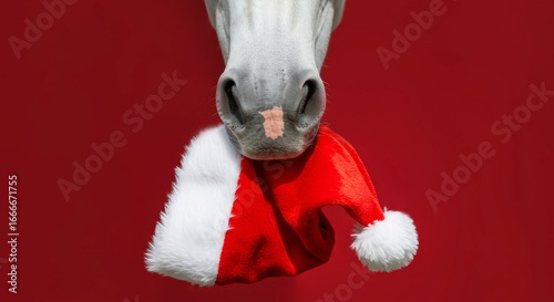 horse, christmas, santa, hat, hold, foal, pony, macro, portrait, nose, muzzle, many-coloured, isolated, red, brown, new year, celebrate, holiday, year, symbol, tradition, postcard, smile, background, eye, decoration, small, cute, 2026, concept, glistering, countryside, eve, congratulation, funny, welcome, animal, farm, season, pose, horse breeding, agriculture, santa, present