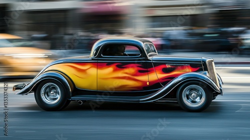 bold, flames, painted, side, cruising, through, city, street, car, speed, road, motion, fast, traffic, automobile, taxi, blur, vehicle, auto, driving, transportation, transport, drive, moving, racing, red, movement, highway, travel, yellow, speeding