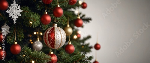 A huge christmas tree decorated with ornamental balls and bokeh lights for christmas celebration