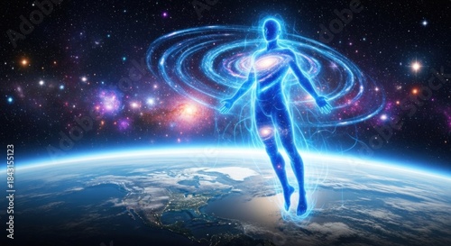 A human figure with a glowing aura and spiral patterns in the background, floating above the Earth.