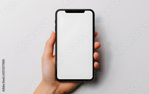 A human hand confidently holds a smartphone, its screen blank, ready to display a world of information and connection. This high-angle shot, on a neutral background.