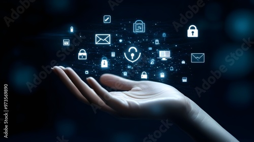 A human hand offering digital icons representing security, communication, and technology, symbolizing innovation and connectivity.