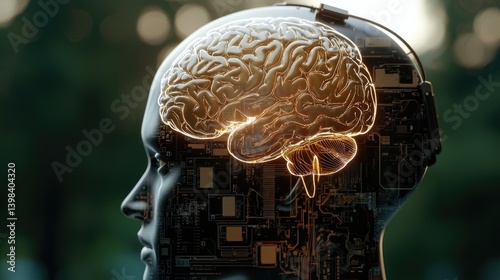 brain, head, anatomy, circuit, circuitry, science, medicals, technology, future, concept, intelligence, thought, process, memory, idea, learning, nerve cell, network, system, artificial, digital, computer, design, abstract, transparent, glowing, light, gold, cortex, cerebra, connection, communication, innovation, development, vision, research, analysis, potential, creativity, imagination, visualise, inside, human, shape, profile, outline, structure