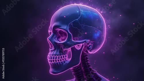 A human skull depicted in a Holographic Fragmentation Portrait where digital glitches and holographic shards reveal multiple facets