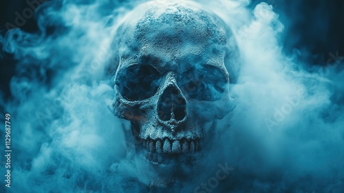 skull, human, smoke, blue, death, dark, mystery, horror, gothic, grisly, eerie, skittish, halloween, fantasy, mystical, ominous, shadowy, mysterious, ghostly, spectral, haunted, ancient, forgotten, grim, bleak, desolate, cold, icy, chilling, terrifying, fear, despair, bone, teeth, jaw, empty, evacuated, darkness, texture, abstract