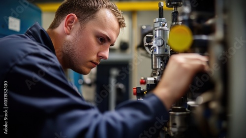 A hydraulic engineer performing a detailed safety check on industrial machinery, ensuring all systems are functioning properly and up to safety standards