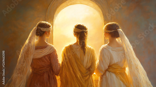A hyper-realistic depiction of the three women standing before the empty tomb, golden morning light reflecting on their astonished faces. The angel’s divine presence glows softly,