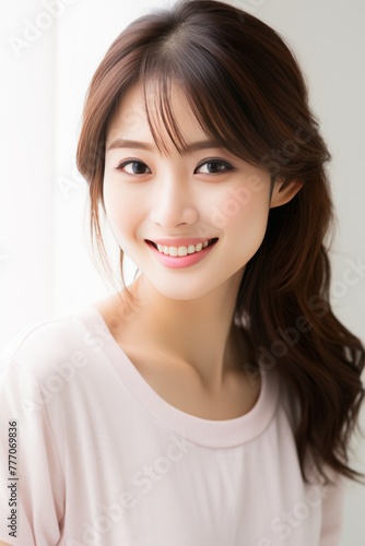 a Japanese woman's radiant smile in a meticulously crafted stock photo, embodying the epitome of professionalism. She is wearing white - pink pastel color on white background.