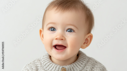 A joyful baby with bright blue eyes smiles brightly, radiating innocence and happiness in a cozy knitted sweater.