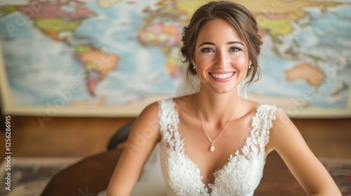 A joyful bride wearing a stunning white gown beams with happiness during her honeymoon in 2025, set against a vibrant world map. Her radiant smile captures the excitement of the moment.
