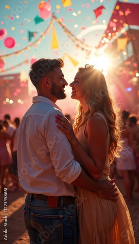 couple, festival, love, joy, celebration, romance, happiness, evening, music, dance, fun, togetherness, party, colourful, light, decoration, playful, festive, attraction, summer, atmosphere, energy, relationship, smile, emotion, sunshine, beauty, cheerful, carefree, young adult, intimacy, hugging, portrait, vibrant, nature, event, candid, lifestyle, friends, warmth, social gathering, crowd