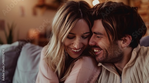 A joyful couple sharing laughter and intimacy on a cozy couch in a warm, inviting atmosphere