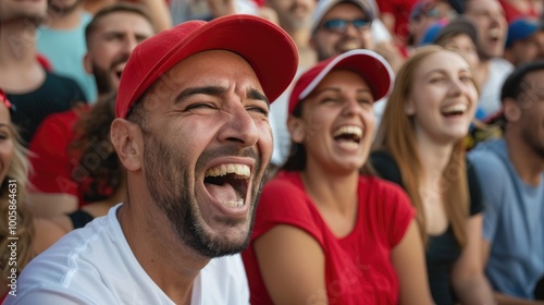 A joyful crowd expressing excitement and laughter during a sporting event, showcasing the thrill of team spirit.