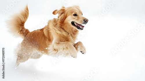 A joyful dog jumping through fresh snow with its tail wagging, isolated on a clean white background, leaving space on the side for text