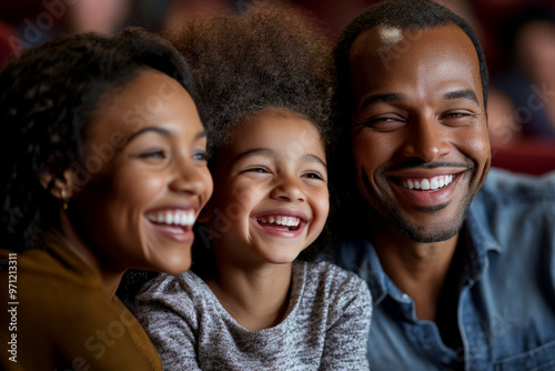 joyful, family, three, their, daughter, seated, together, motion picture, theatre, smiling, enjoying, film, sitting, laugh, delight, making, smile, warmly