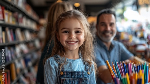 A joyful girl smiles in a cozy bookstore with colorful pencils.