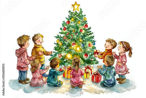 christmas, tree, children, holiday, gift, wonder, memory, ornament, spirit, cheer, nostalgia, sharing, hope, togetherness, playful, giving, warmth, magic, community, tradition, star, light, artwork, laughter, creativity, joy, festive, colours, bliss, wishes, smile, scene, kindness, happiness, activity, snowy, blessing, love, decoration, fun, family, cheerfulness, illustration, santa, celebration, candy, winter