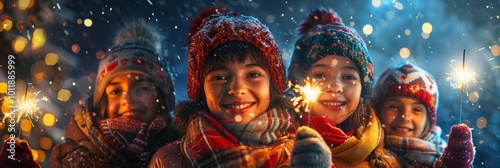 A joyful group of friends, holding sparklers, pose in front of a festively decorated Christmas tree with glowing lights, creating a cheerful holiday scene, banner